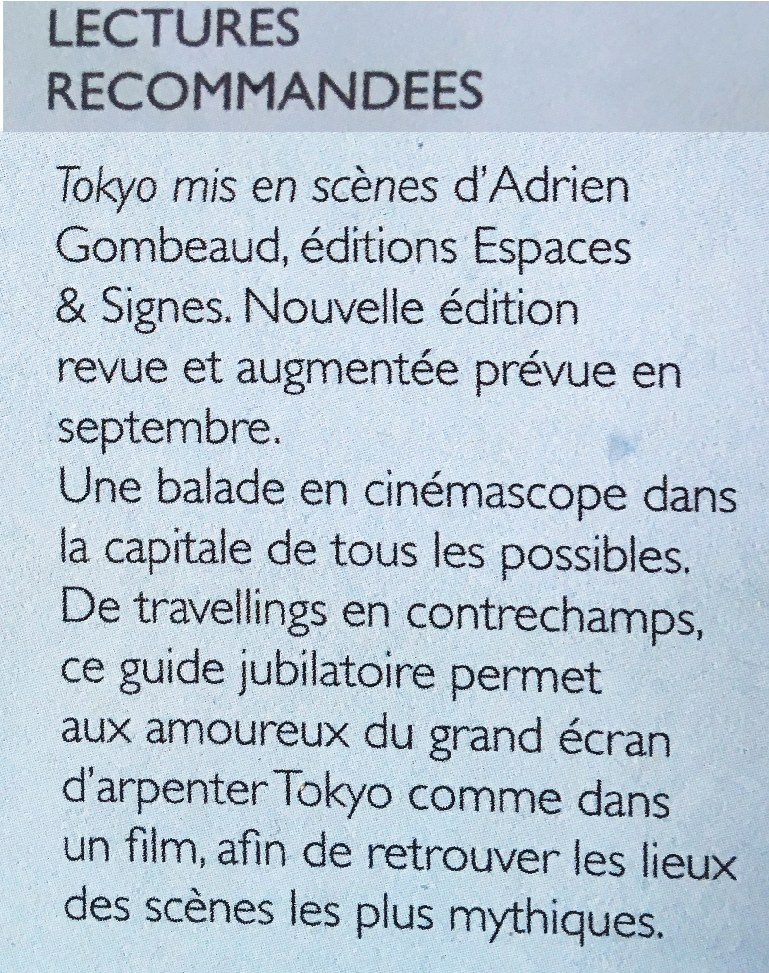 Ville tentaculaire, Tokyo est aussi un assemblage de villages, de temples et de bistrots, de maisonnettes et de gratte-ciel, de jardinets et de quartiers nocturnes. C’est ce Tokyo mis en scène par de nombreux cinéastes de toutes nationalités qu’Adrien Gombeaud nous invite à revisiter. Un voyage dont le cinéma est le fil conducteur et qui permettra à beaucoup de retrouver les lieux des scènes les plus mythiques des nombreux films qui y furent tournés.