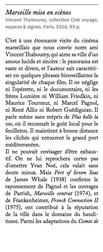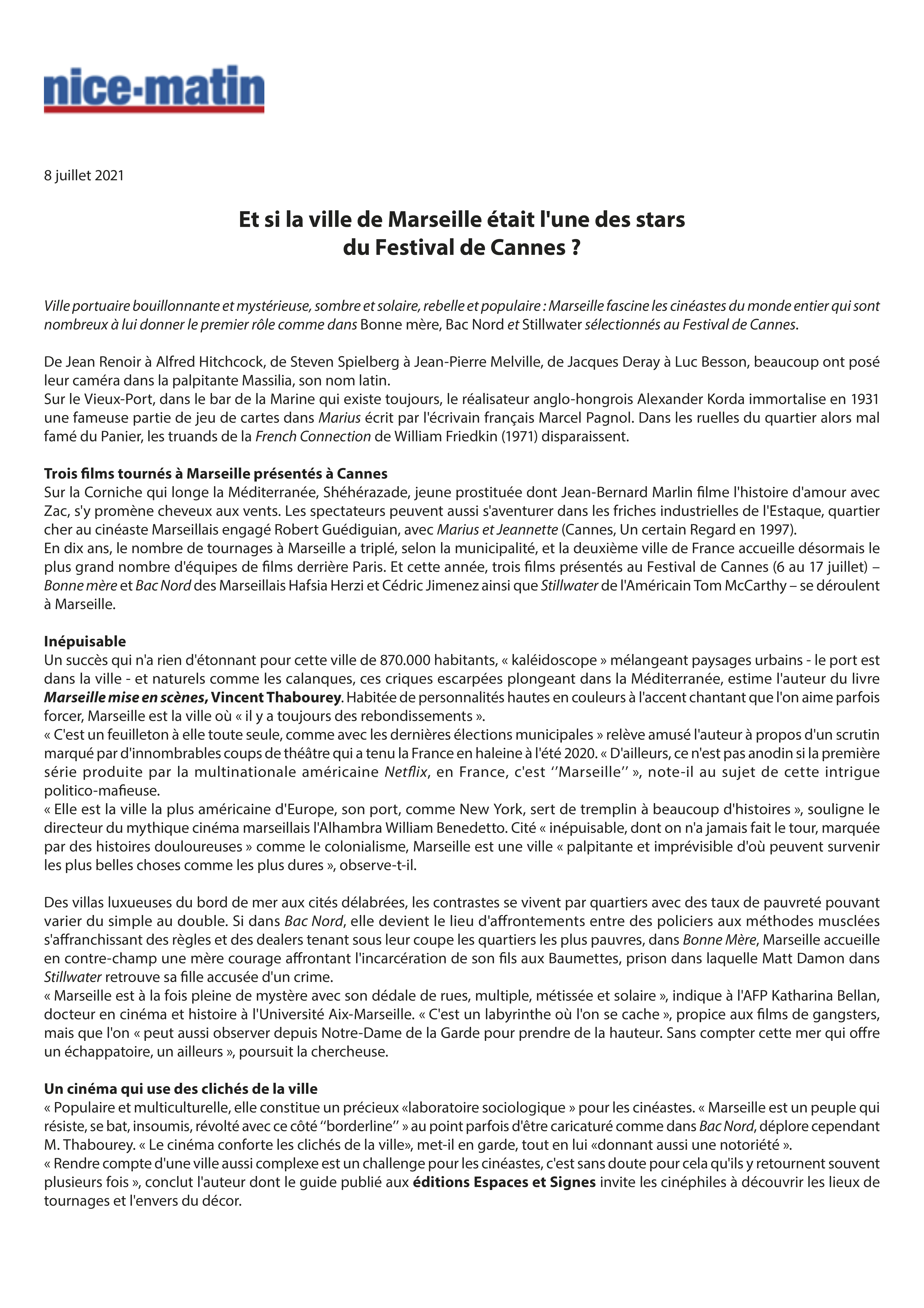 Ville solaire et méditerranéenne, Marseille est la capitale régionale la plus filmée de France. Marcel Pagnol, Jean Renoir, Jacques Demy, Jean-Pierre Melville, William Friedkin et, bien sûr, Robert Guédiguian y ont posé leur caméra pour nous en révéler une image à chaque fois différente.En parcourant les lieux de tournage de scènes cultes ou emblématiques, Vincent Thabourey nous fait redécouvrir plus de soixante-dix films dans ce ciné-guide de Marseille enrichi de nombreuses cartes et de plusieurs index (films, réalisateurs, lieux).Cette réédition est enrichie de sept nouveaux films (dont La Villa de Robert Guédiguian, Shéhérazade, primé à Cannes, et Taxi 5 ).
